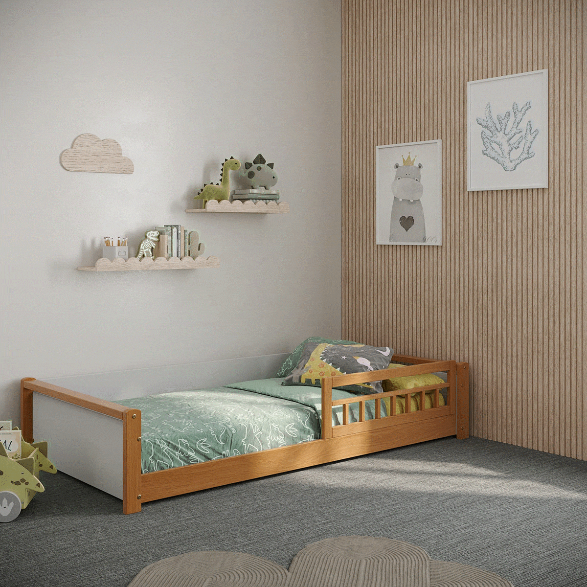 A cama de solteiro montessoriana combina funcionalidade e charme em um só móvel. Pode ser usada tanto na altura tradicional quanto rente ao chão, promovendo independência e segurança para os pequenos. Com design moderno e acabamento cuidadoso, ajuda a criar um quarto prático, acolhedor e bem organizado.